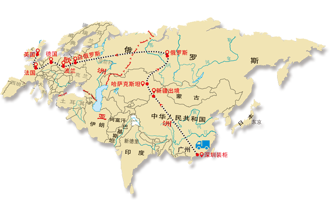 卡航線路:深圳(裝柜)--新疆(出境)-哈薩克斯坦—俄羅斯-白俄羅斯—波蘭—德國—法國-英國保稅倉